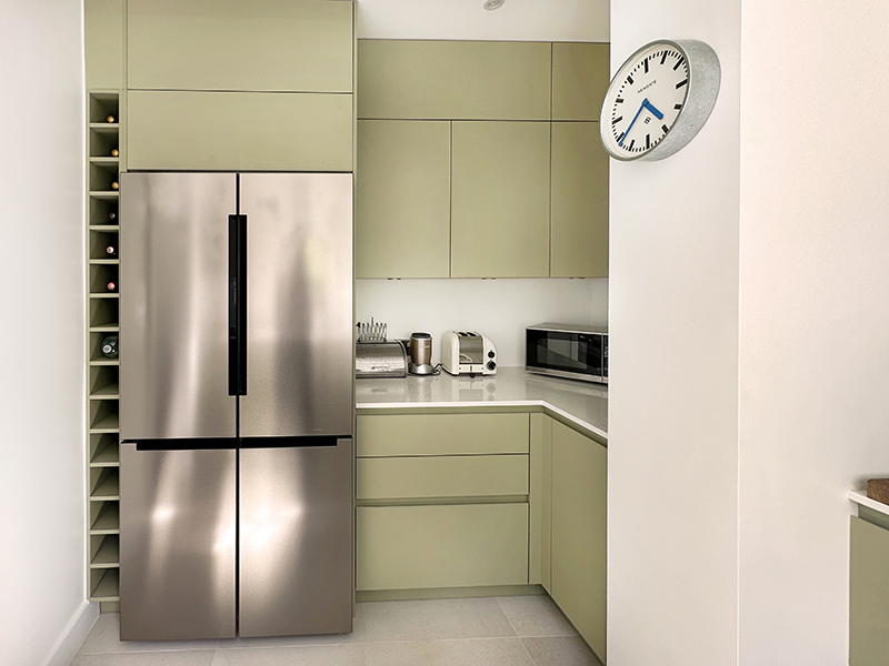 Working around a central pillar and outdated electrics, we reimagined the space to maximise every inch. The result is a streamlined, handleless kitchen featuring ceiling-height cabinetry with bespoke top boxes for extra storage, a stunning 2.3m wine rack, and carefully planned appliance placement that accommodates a larger 80cm Neff induction hob and Samsung American-style fridge freezer without compromising flow.