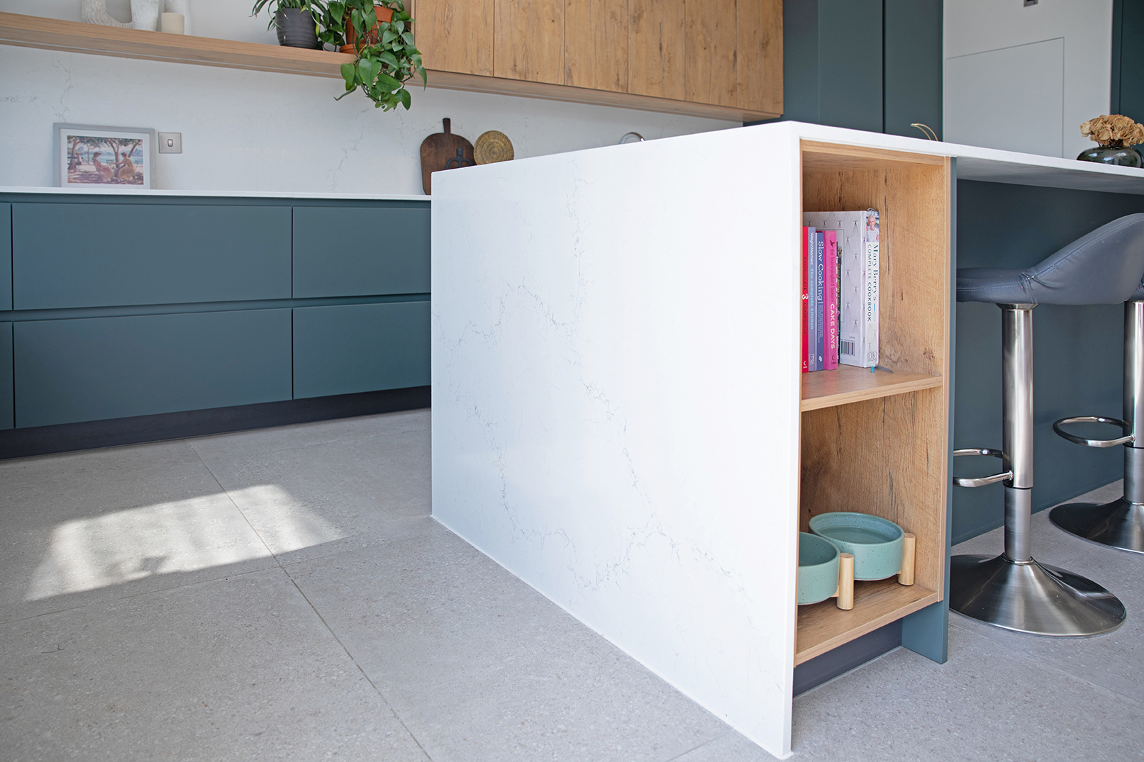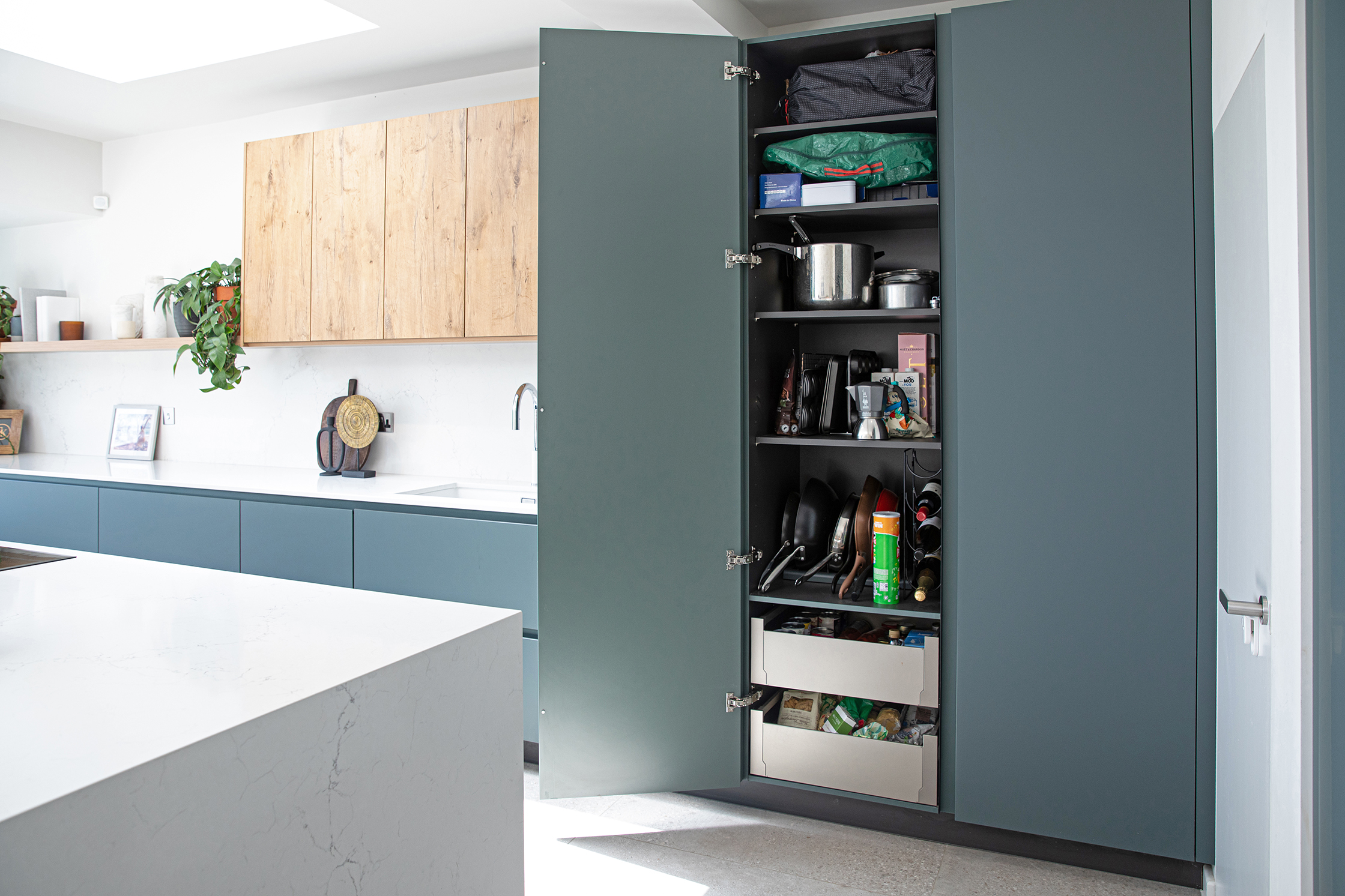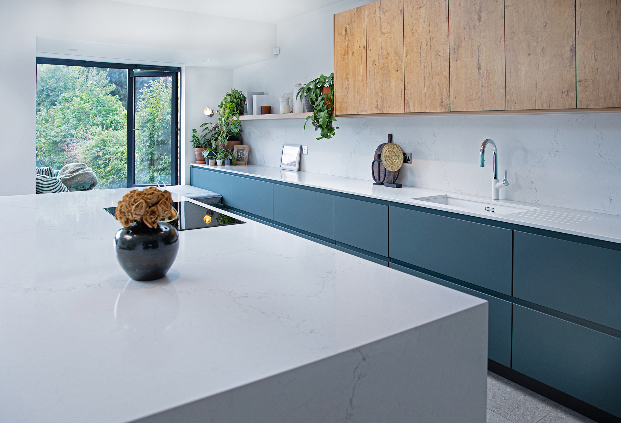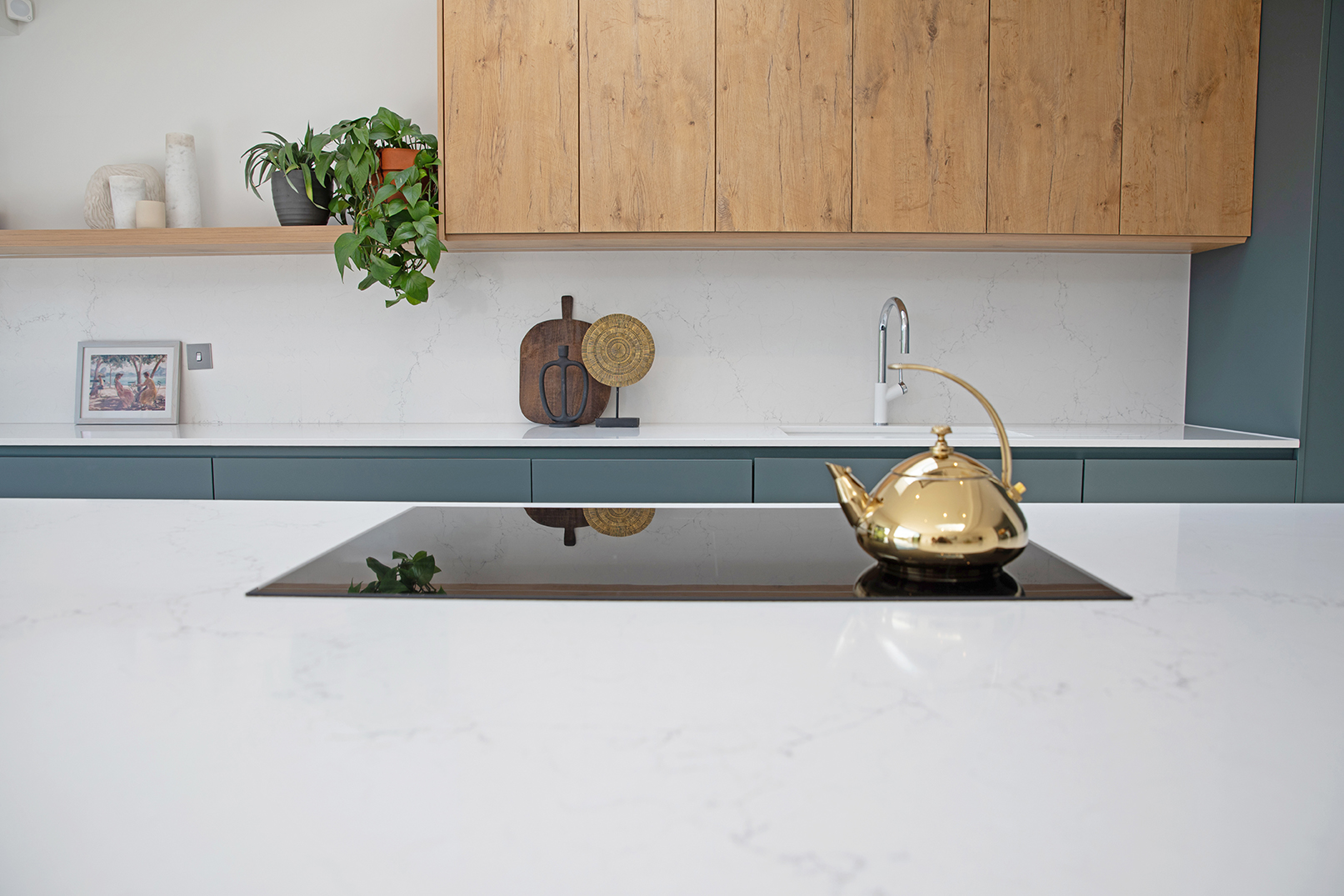 This bold yet refined kitchen design showcases a Pronorm Y-Line in ultra-matt dark green, softened with natural oak accents and finished with a marble look Unistone Carrara Misterio worktop.