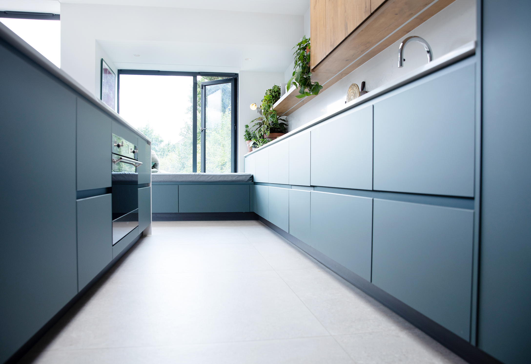 The handleless layout keeps the space sleek and modern, while oak shelving and panel details add warmth and balance. A Bosch Flex Induction hob, Smeg oven, and Blanco sink and tap complete the premium setup, combining style with everyday practicality.